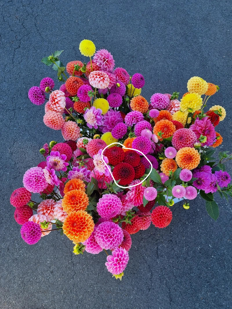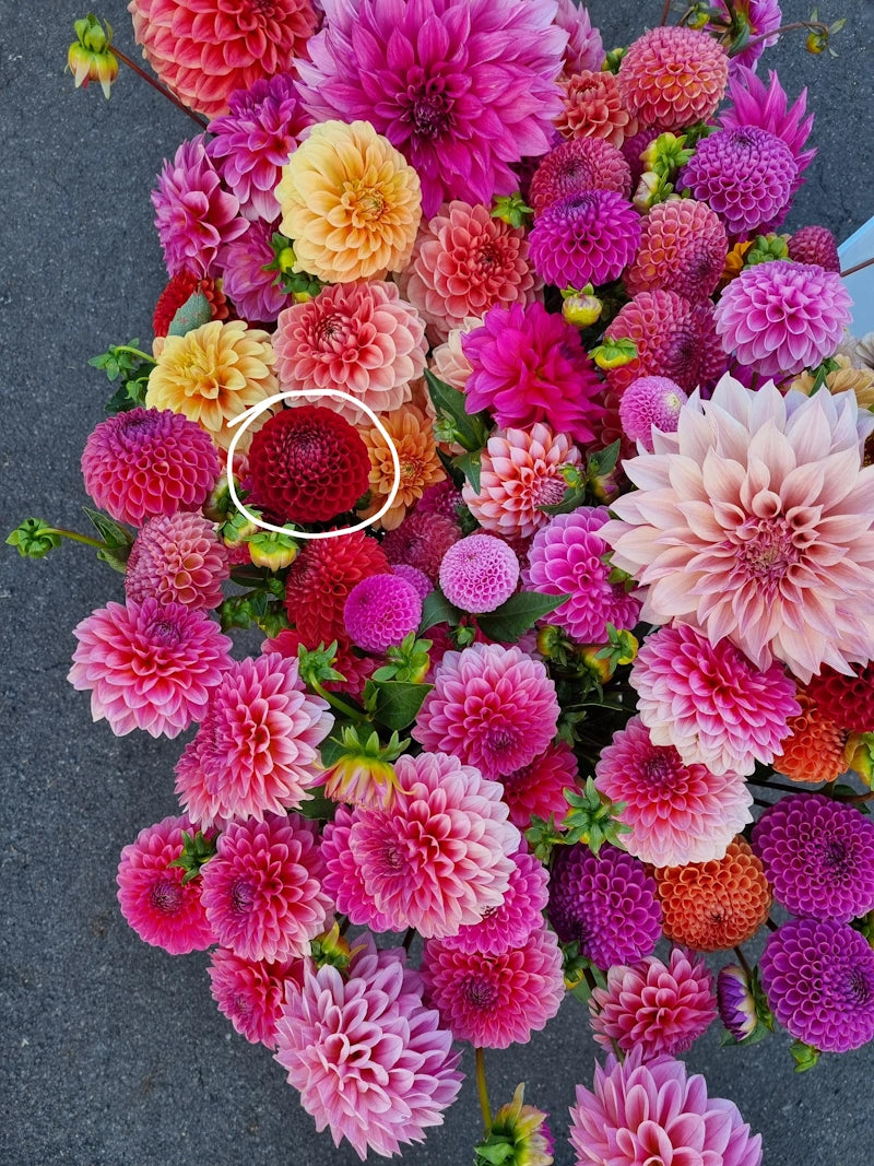 *Please note Cornel is the Red Ball Dahlia bloom indicated by the white outline in both images*